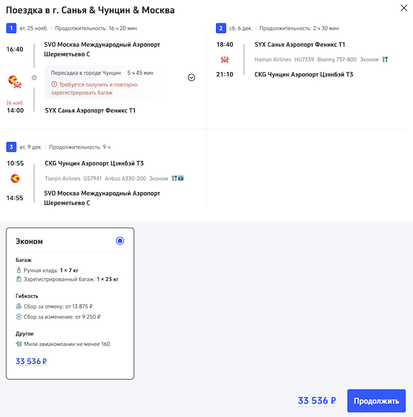 С остановкой в Чунцине на несколько дней: Москва — Санья 25 ноября, Санья — Чунцин 6 декабря, Чунцин — Москва 9 декабря