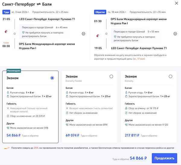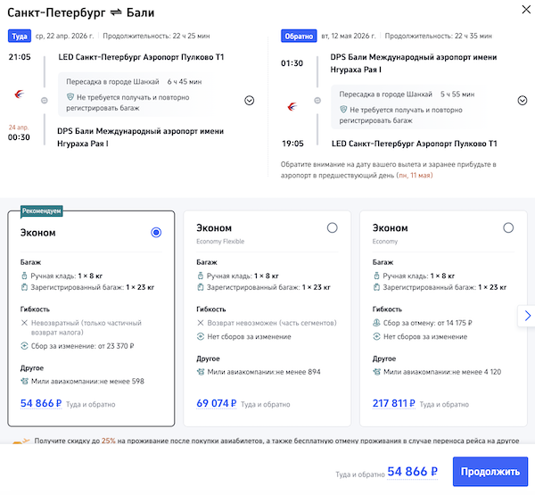Билеты из Санкт-Петербурга на Бали весной и летом от 54.900 рублей туда-обратно.