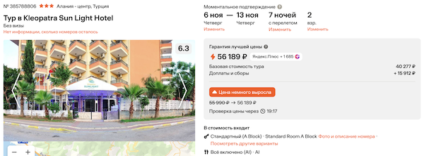 Kleopatra Sun Light Hotel 3* 28.100 рублей за человека (56.200 рублей за двоих)