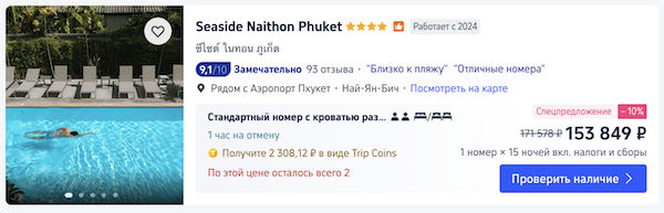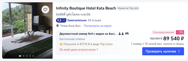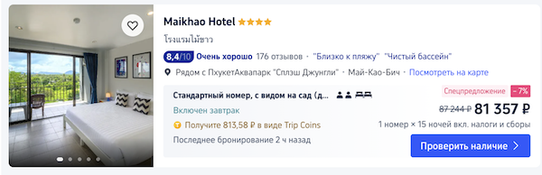 Отели с оплатой российской картой на трип.ком. Пример отелей на 15 ночей с 21 декабря по 5 января (двухместные номера)