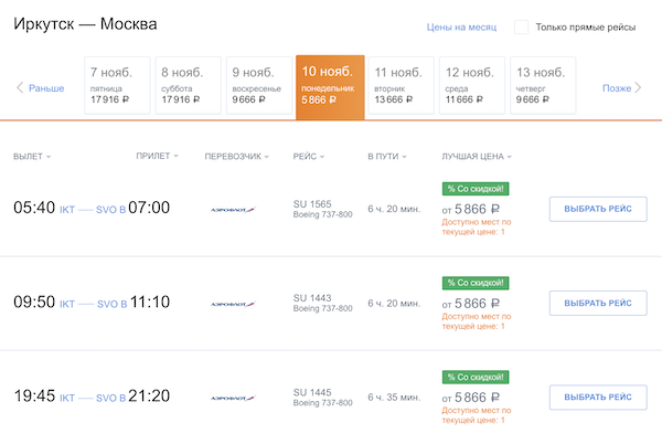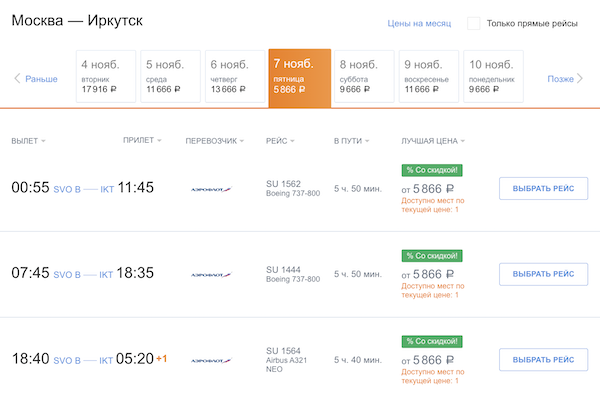 Аэрофлот: из Москвы в Иркутск на выходные 11.700 рублей туда-обратно.