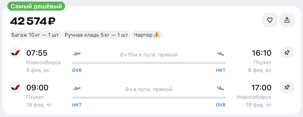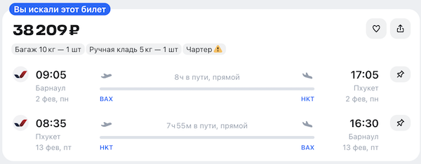 Прямые чартерные рейсы на Пхукет в феврале: из Красноярска, Барнаула, Перми и других городов от 34.000 рублей туда-обратно.
