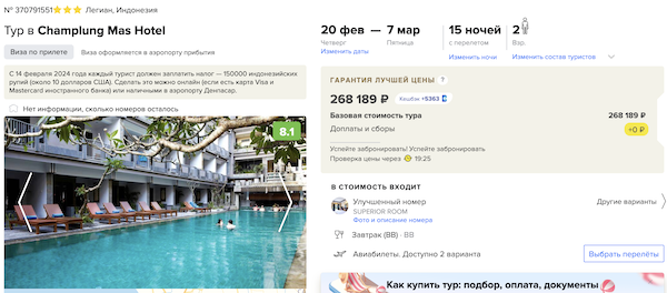 Champlung Mas Hotel 3* с завтраками 134.100 рублей за человека (268.200 рублей за двоих)