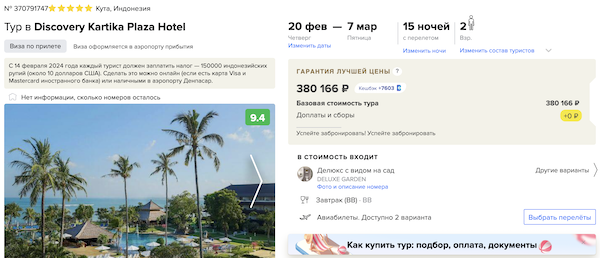 Discovery Kartika Plaza Hotel 5* с завтраками 190.100 рублей за человека (380.200 рублей за двоих)