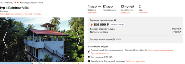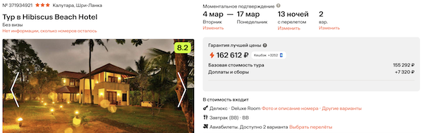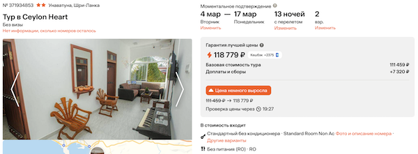 Ceylon Heart 2* 59.400 рублей за человека (118.800 рублей за двоих)
