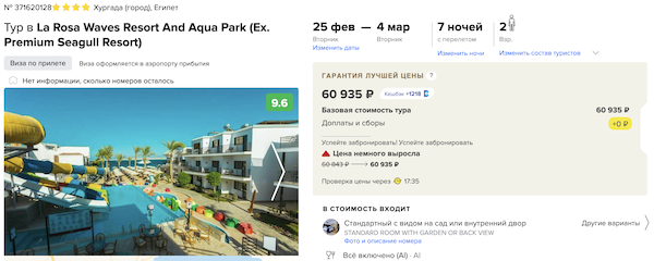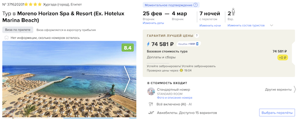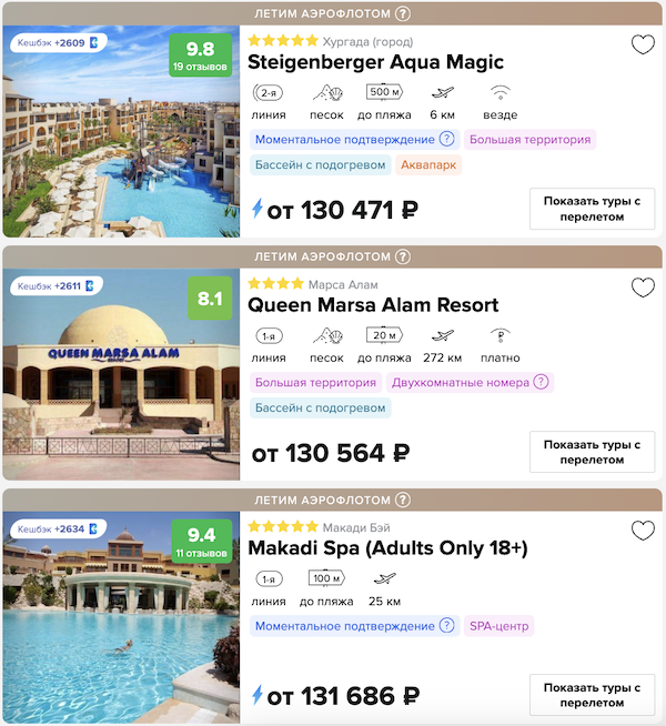 Прямой перелет Аэрофлотом из Москвы в Хургаду, трансферы и неделя в отеле от 30.400 рублей за человека.