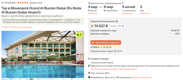 Movenpick Grand Al Bustan Dubai 5* 37.200 рублей за человека (74.500 рублей за двоих)