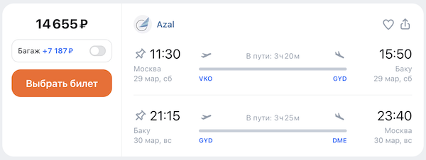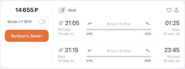 Из Москвы в Баку в марте 14.700 рублей туда-обратно.