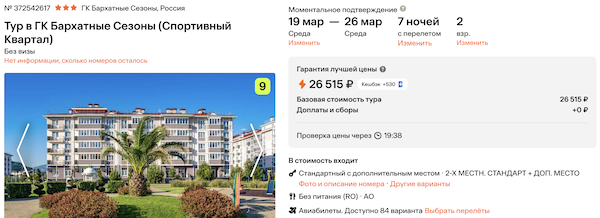 ГК Бархатные Сезоны 3* 13.200 рублей за человека (26.500 рублей за двоих)