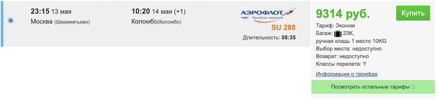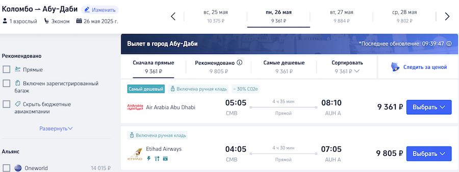 Например, Коломбо — Абу-Даби 26 мая 9.400 рублей