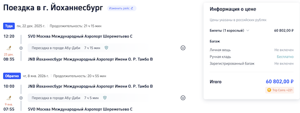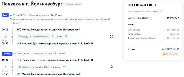 Новый год 2026 в ЮАР: билеты из Москвы в Йоханнесбург от 60.800 рублей туда-обратно.