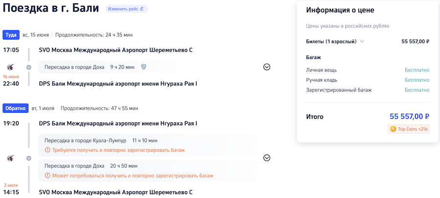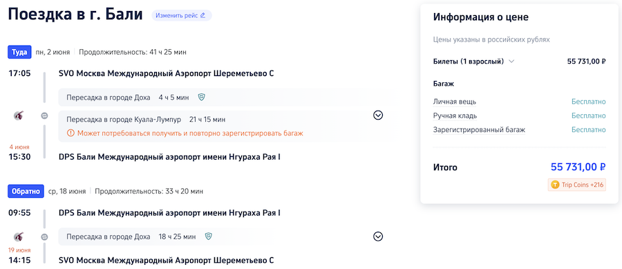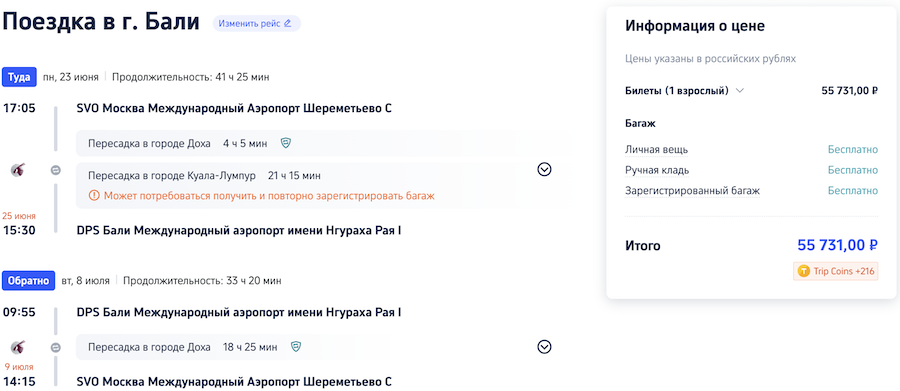 Рейсы выполняются с пересадкой в Дохе и дополнительной пересадкой в Куала-Лумпуре по дороге из Москвы или на обратном пути.