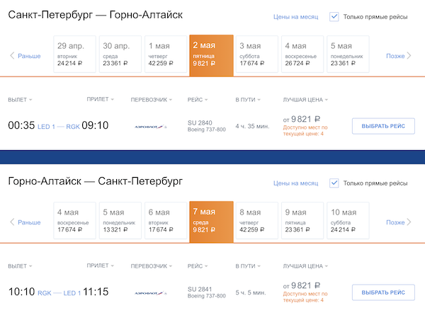 Прямые рейсы Аэрофлота из Санкт-Петербуга в Горно-Алтайск в начале мая 19.600 рублей туда-обратно.