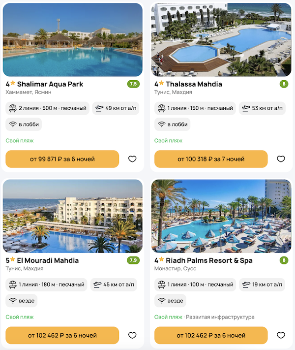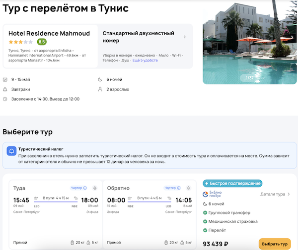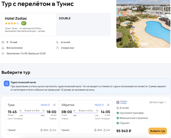 Туры из Санкт-Петербурга в Тунис в мае: прямой перелет, трансферы и проживание в отеле от 46.700 рублей за человека.