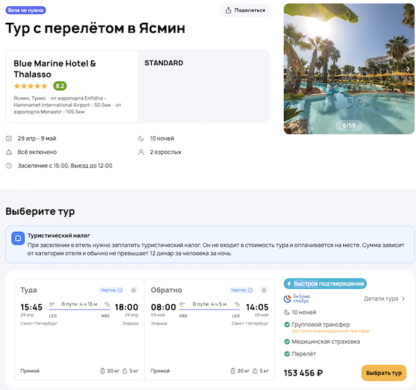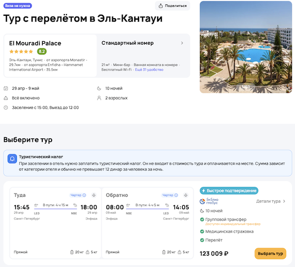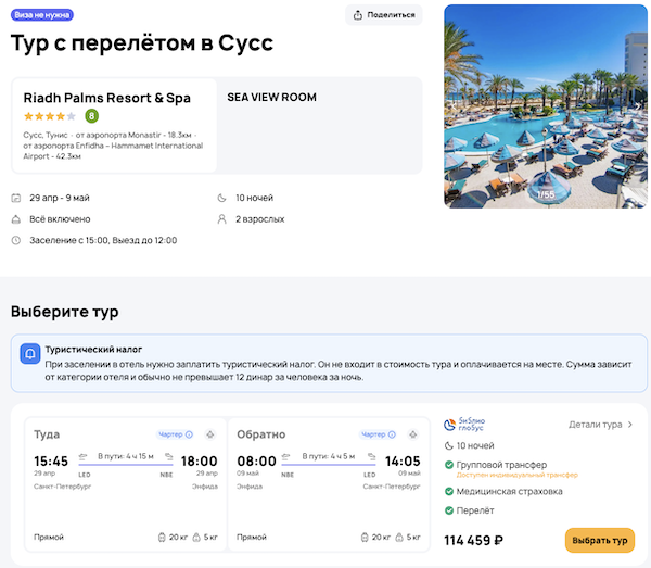 Туры из Санкт-Петербурга в Тунис на майские праздники: прямой перелет, трансферы и проживание в отеле «все включено» от 57.200 рублей за человека.