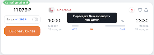 3. Маскат — Москва 15 июня (с 8 часовой дневной пересадкой в Шардже) 11.100 рублей.