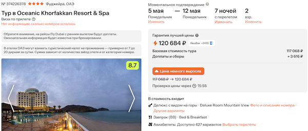 Oceanic Khorfakkan Resort & Spa 4* с завтраками 60.300 рублей за человека (120.700 рублей за двоих)