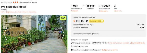Biboluo Hotel 3* с завтраками 64.600 рублей за человека (139.200 рублей за двоих)
