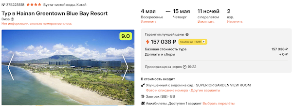 Hainan Greentown Blue Bay Resort 4* с завтраками 78.500 рублей за человека (157.000 рублей за двоих)