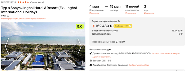 Sanya Jinghai Hotel &Resort 5* с завтраками 81.200 рублей за человека (162.500 рублей за двоих)
