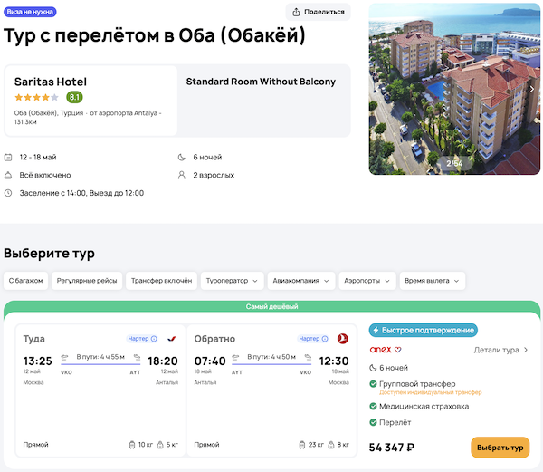 Saritas Hotel 4* 27.100 рублей за человека (54.300 рублей за двоих)