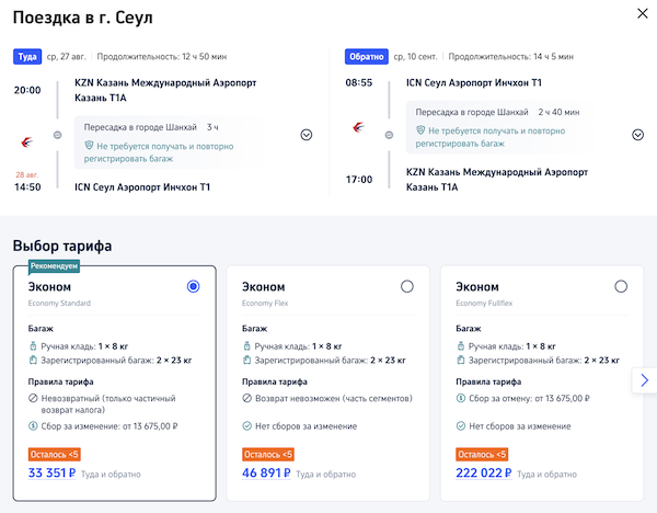 Билеты из Казани в Сеул 33.300 рублей туда-обратно.