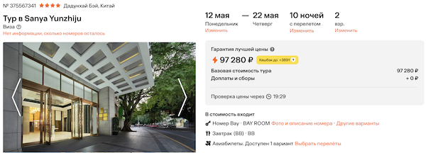 Sanya Yunzhiju 4* с завтраками 48.600 рублей за человека (97.300 рублей за двоих)