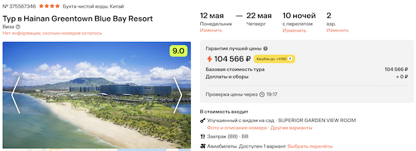 Hainan Greentown Blue Bay Resort 4* с завтраками 52.300 рублей за человека (104.600 рублей за двоих)