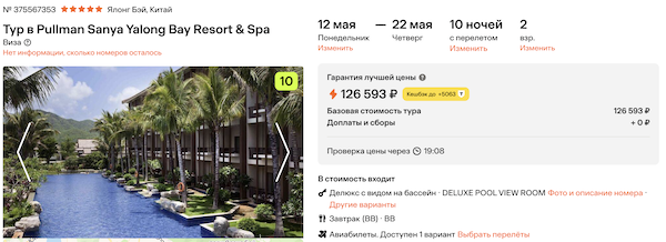 Pullman Sanya Yalong Bay Resort & Spa 5* с завтраками 63.300 рублей за человека (126.600 рублей за двоих)