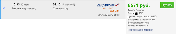 Из Москвы в Санью 15 или 16 мая. Блоки мест на регулярных рейсах Аэрофлота доступны на сайте Библио-Глобус: