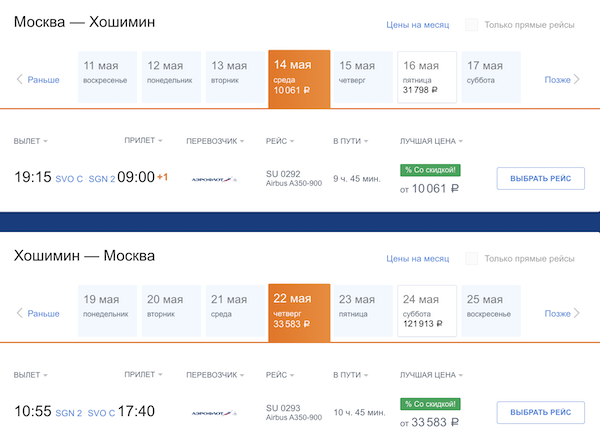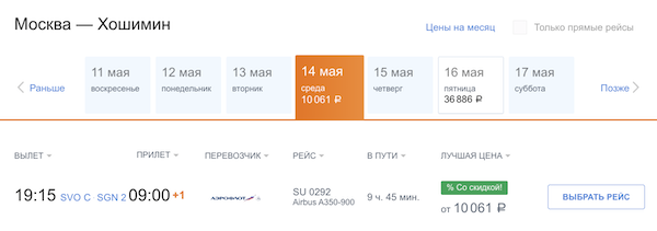 1. Из Москвы в Хошимин 14 мая 10.000 рублей, билеты на сайте Аэрофлота.