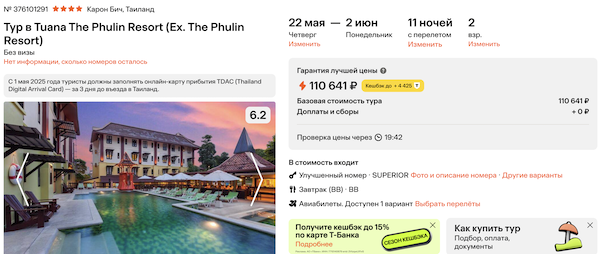 Tuana The Phulin Resort 4* с завтраками 55.300 рублей за человека (110.600 рублей за двоих)
