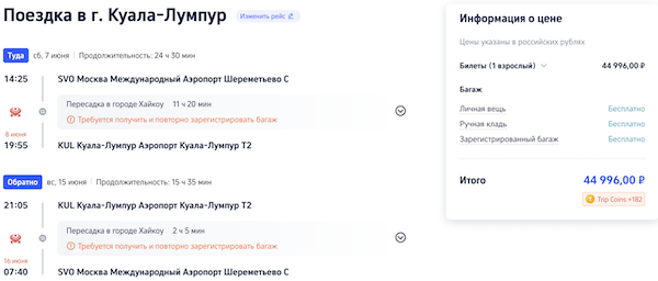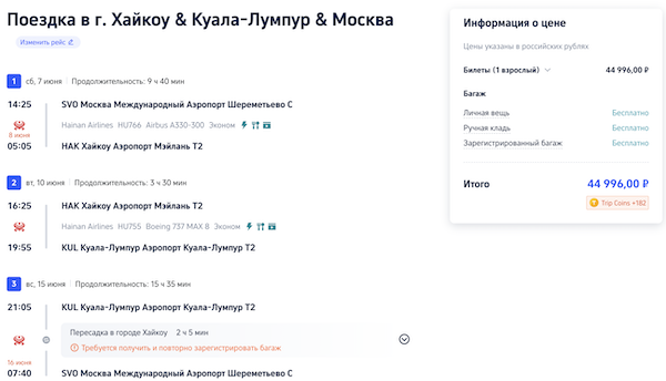 Например, Москва — Хайкоу 7 июня; Хайкоу — Куала-Лумпур 10 июня; Куала-Лумпур — Москва 15 июня.