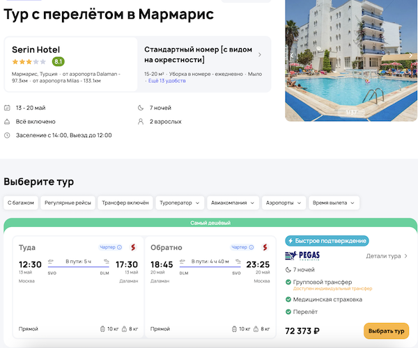 Serin Hotel 3* 36.200 рублей за человека (72.400 рублей за двоих)