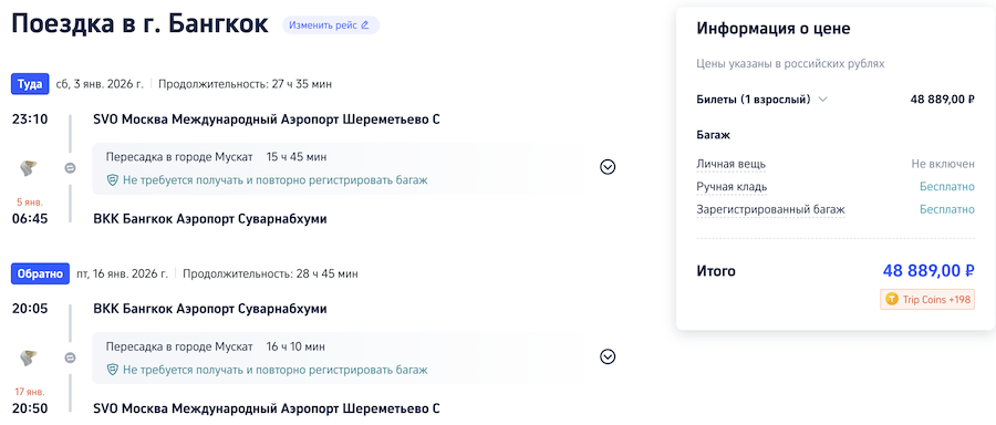 Билеты из Москвы в Бангкок 48.900 рублей туда-обратно.