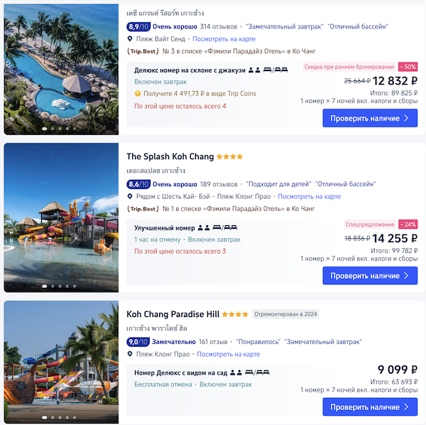 Отели с оплатой российской картой на трип.ком. Например, неделя на Ко Чанге: