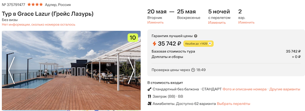 Грейс Лазурь 3* с завтраками 17.800 рублей за человека (35.700 рублей за двоих)