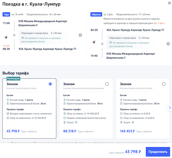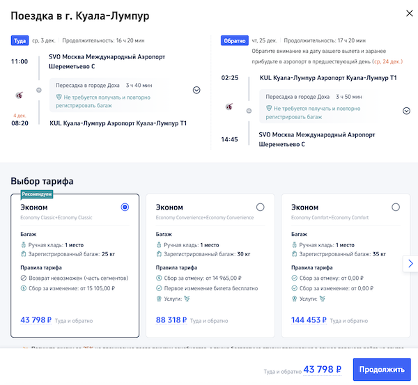 Рейсы выполняются с короткой пересадкой в Дохе.