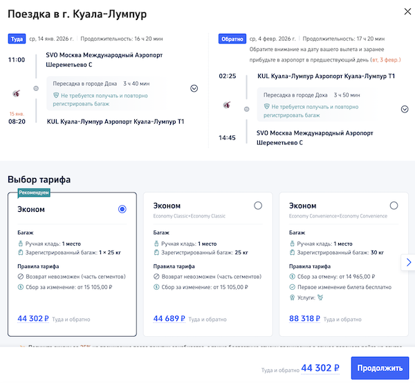 Qatar Aiways: из Москвы в Малайзию зимой от 43.800 рублей туда-обратно.