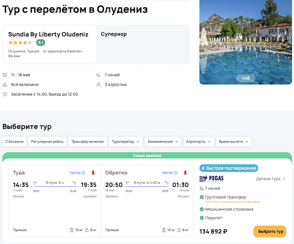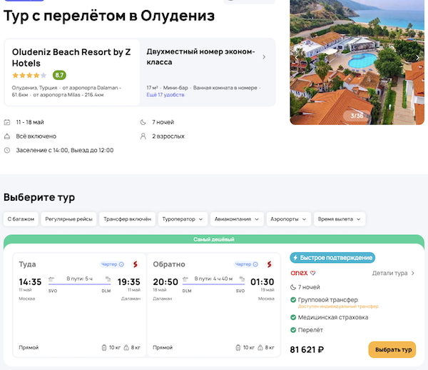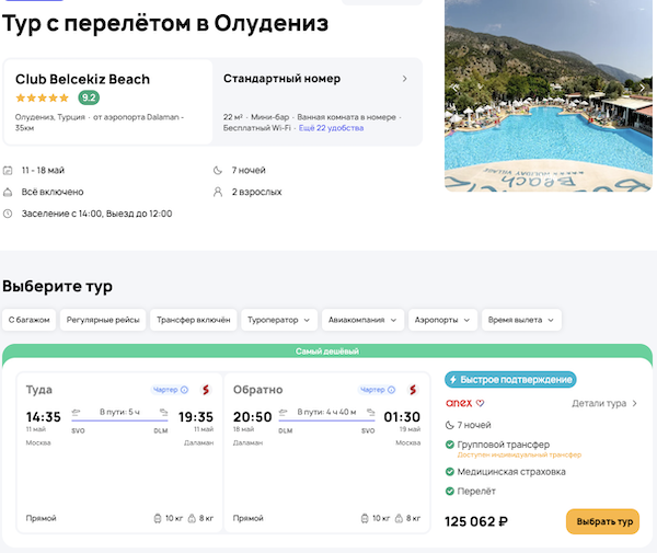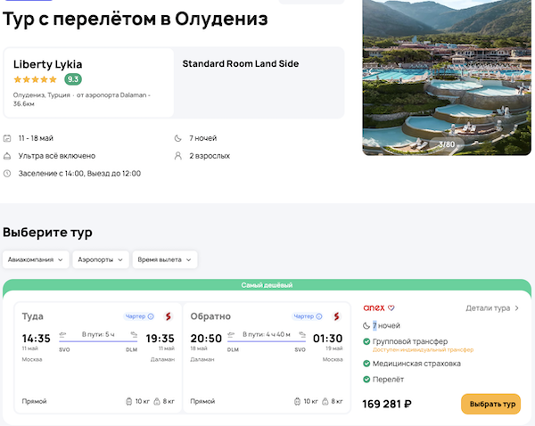 — прямой перелет в Даламан и обратно;