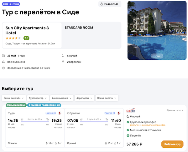Sun City Apartments & Hotel 4* 28.600 рублей за человека (57.300 рублей за двоих)