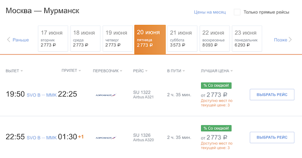 Из Москвы в Мурманск в июне от 6.000 рублей туда-обратно.