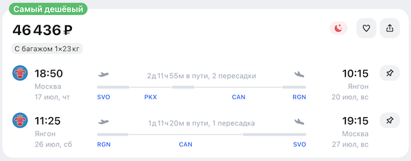 Из Москвы в Янгон (Мьянма) в июле 46.400 рублей туда-обратно.