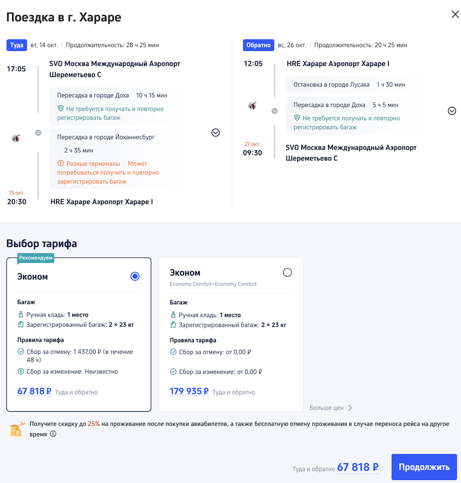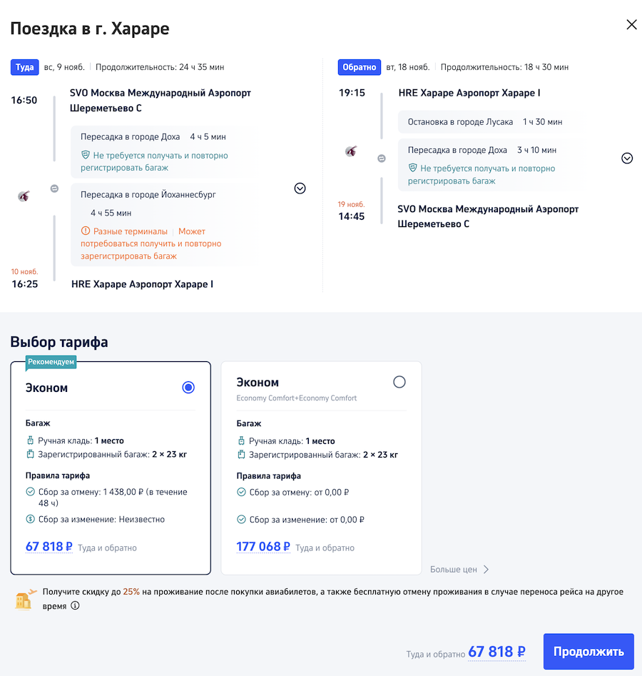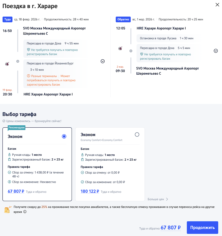Рейсы выполняются Qatar Airways с пересадкой в Дохе и Йоханнесбурге по дороге из Москвы, на обратном пути техническая остановка в Лусаке и пересадка в Дохе.