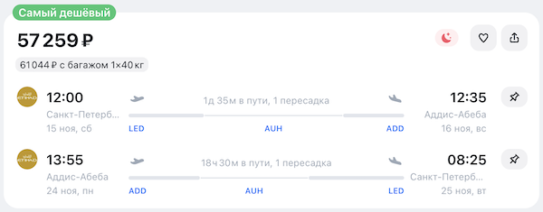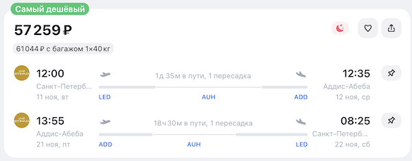 Из Санкт-Петербурга в Эфиопию: билеты в Аддис-Абебу от 57.300 рублей туда-обратно.