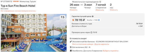 Sun Fire Beach Hotel 3* 39.000 рублей за человека (78.100 рублей за двоих)
