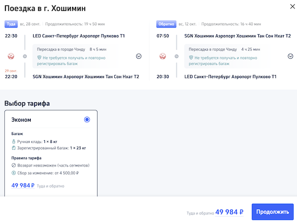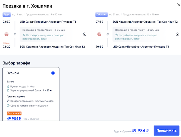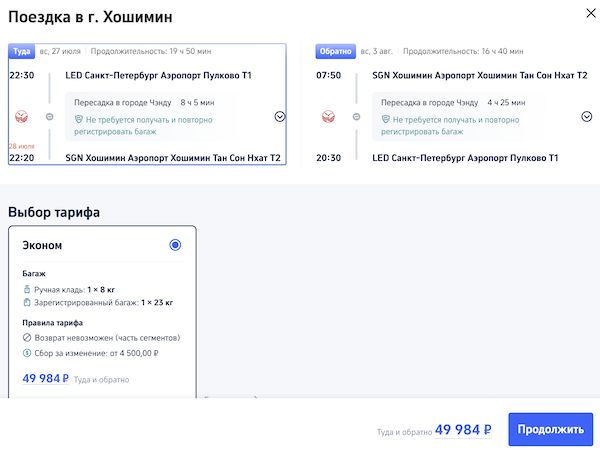 Из Санкт-Петербурга во Вьетнам от 50.000 рублей туда-обратно.
