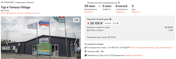 Тамыш Village с завтраками 13.000 рублей за человека (26.100 рублей за двоих)