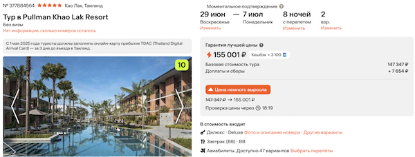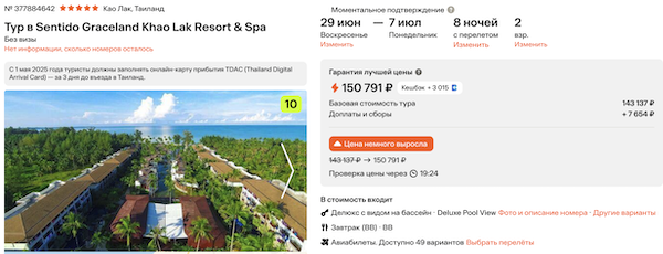 Туры из Москвы в Таиланд: прямой перелет на Пхукет, трансферы и проживание в 5* отеле в Као Лаке от 75.400 рублей за человека.