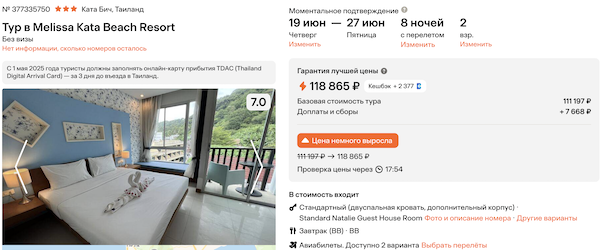 Melissa Kata Beach Resort 3* с завтраками 59.400 рублей за человека (118.900 рублей за двоих)